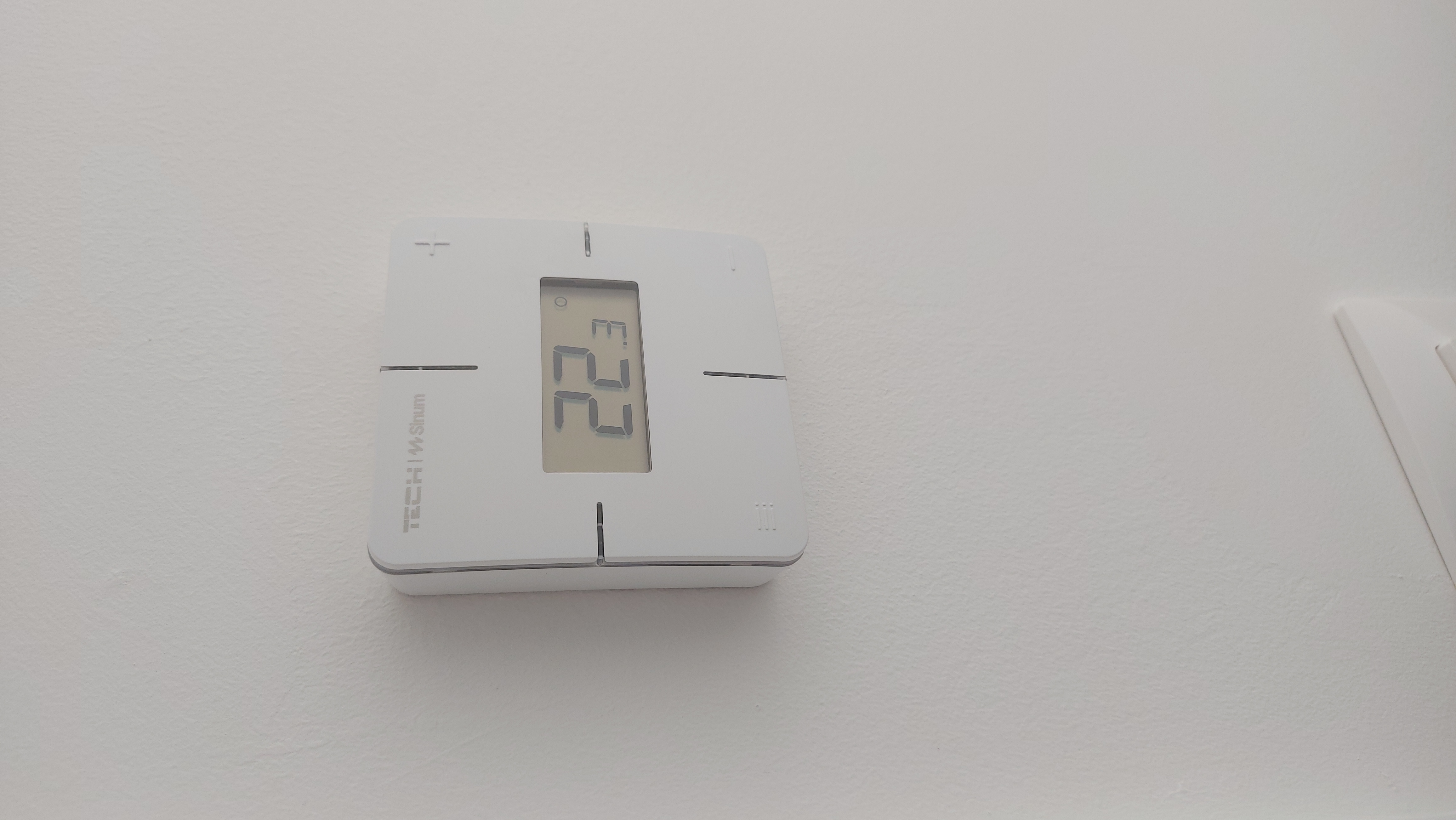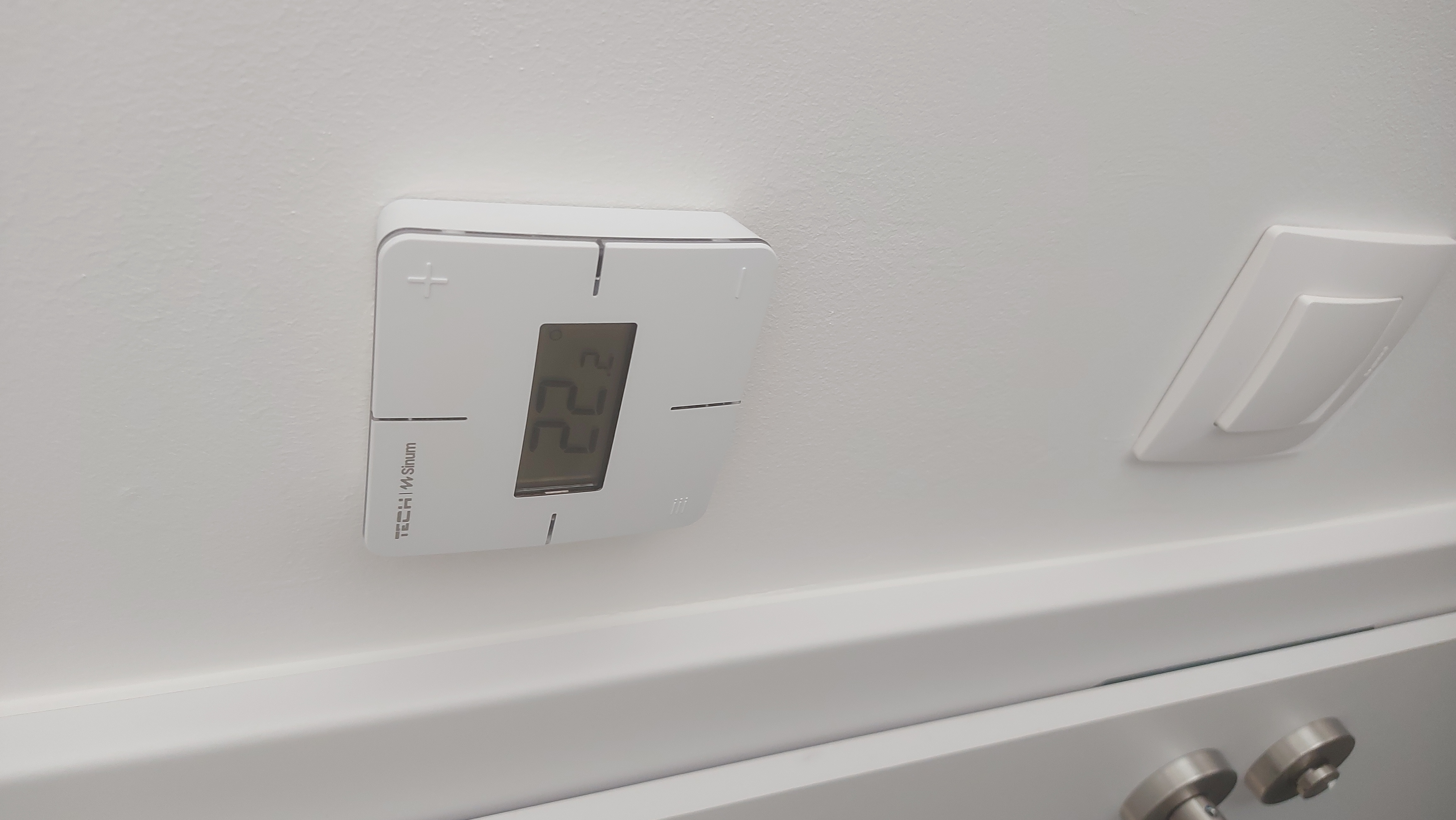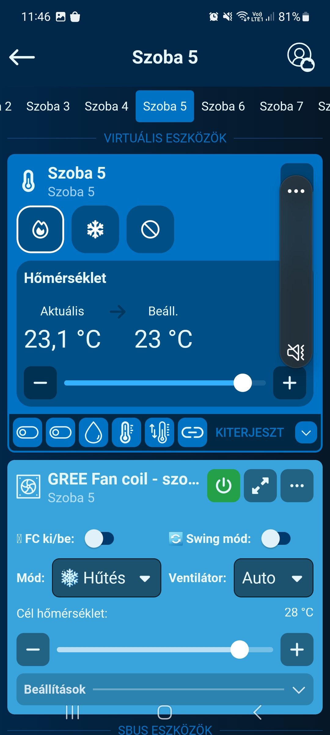 A szobai termosztátok szintén digitálisan kommunikálnak a központi automatikával, így elég volt egy kábelt végigfűzni, és szintén folyamatos adatátvitel valósul meg a központi egységgel, és így az applikációval is.